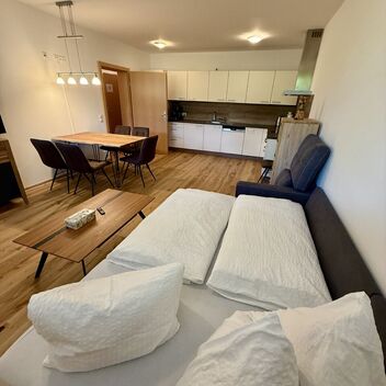 - Obývací pokoj – rozkládací gauč, jídelní stůl