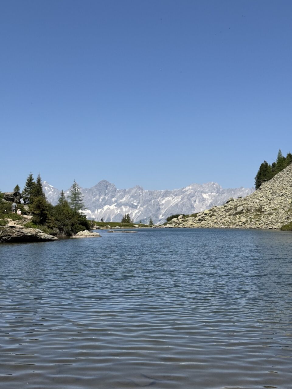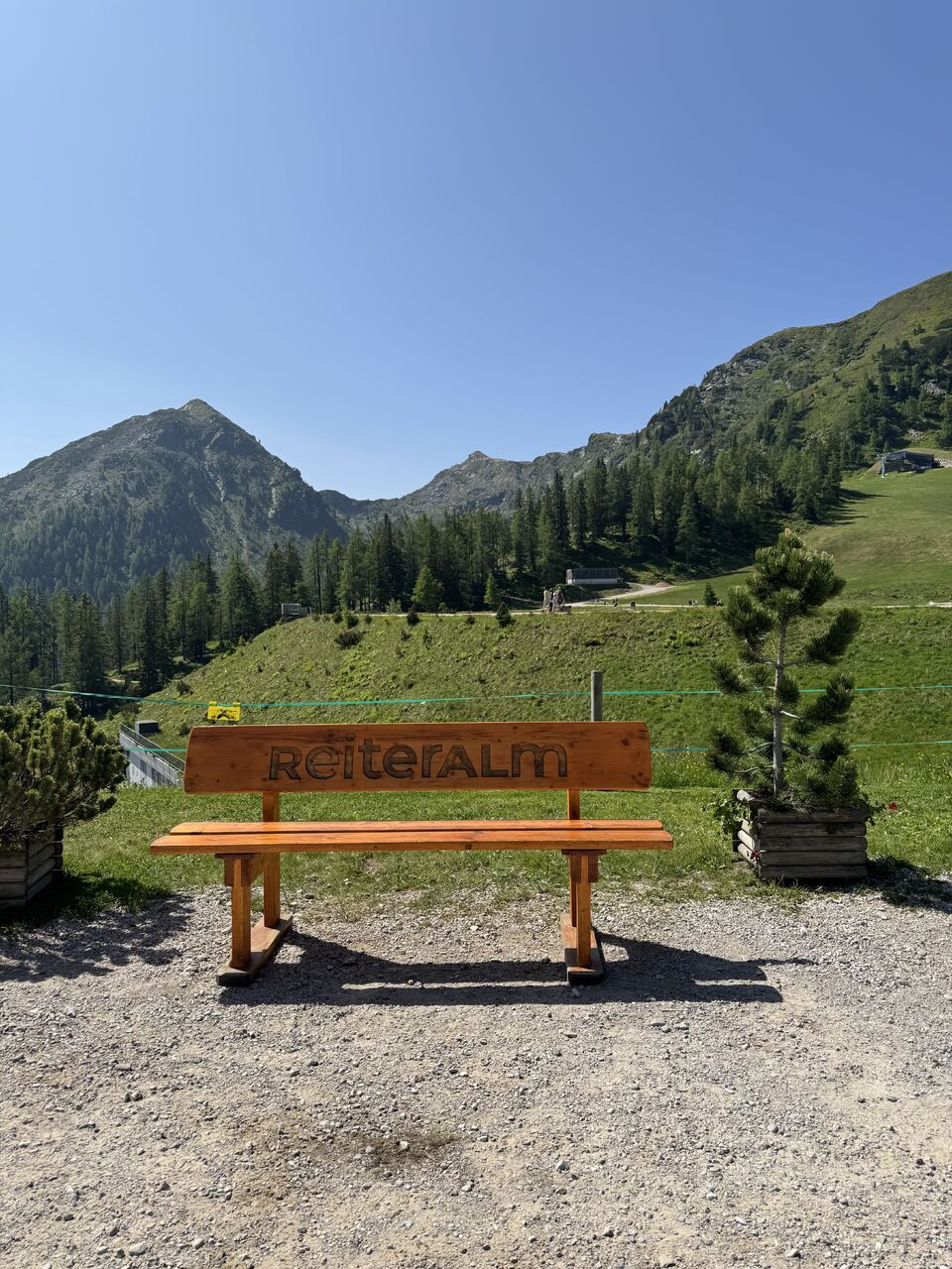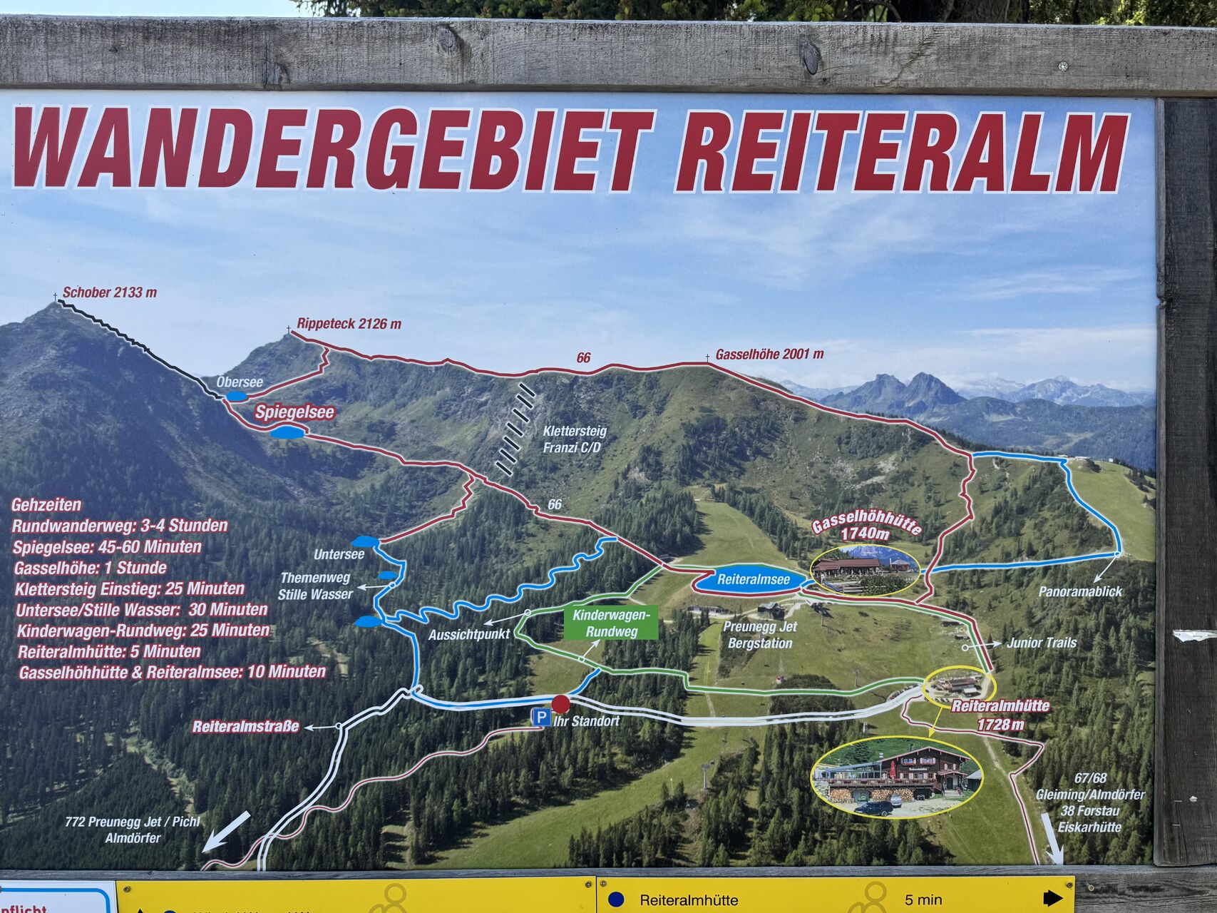 Naše nezapomenutelná túra začíná u horní stanice lanovky Reiteralm (Preunegg Jet), kam jsme se pohodlně vyvezli bez nutnosti kupovat lístek díky naší Sommercard – chytrý tip pro vaši dovolenou u nás! Jen pár kroků od lanovky nás přivítá první jezero Reiteralmsee.